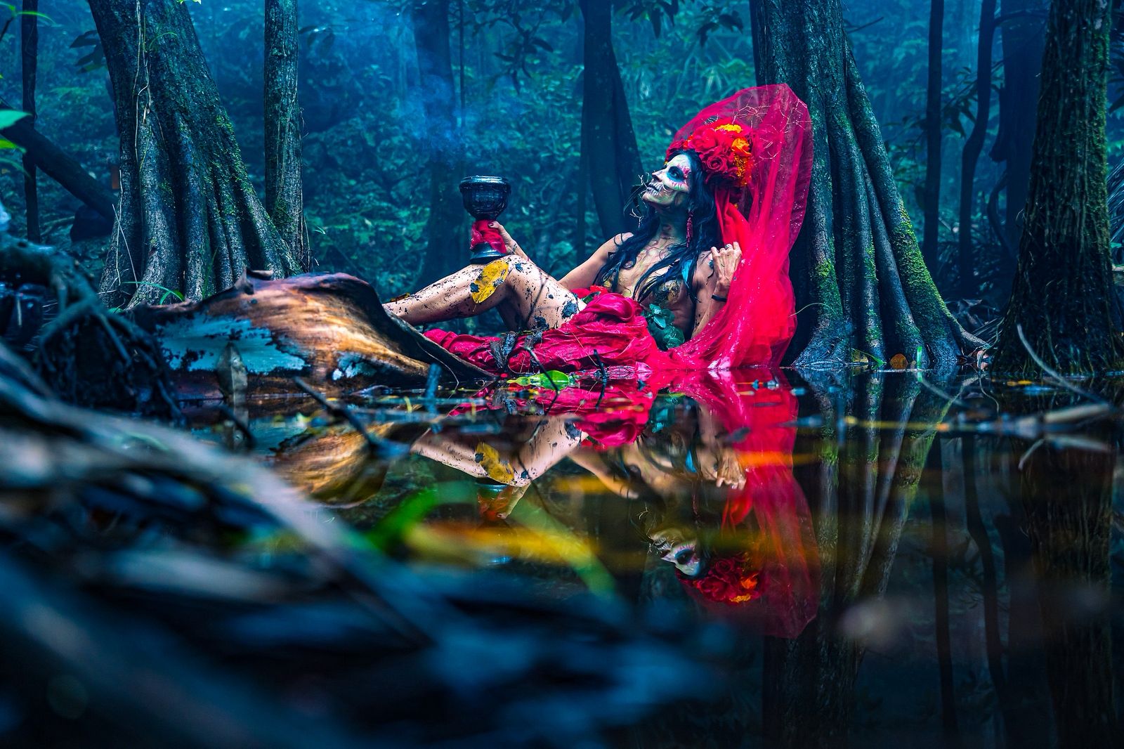 La Catrina, reimaginada como mensajera de la Madre Naturaleza, regresa a la Tierra durante tres días cada año. Viaja a través de cuatro portales elementales — Agua, Fuego, Aire y Tierra — simbolizando un recorrido por la emoción humana, la creación, la destrucción, la memoria y el renacimiento. Cada sesión fotográfica, video y propuesta inmersiva se realizó con docenas de colaboradores: buzos de apnea, buzos de seguridad, estilistas, equipos de cámara subacuática, diseñadores de vestuario y músicos. Es una mitología moderna llevada a la vida mediante logística real y una producción artística de alto nivel.
